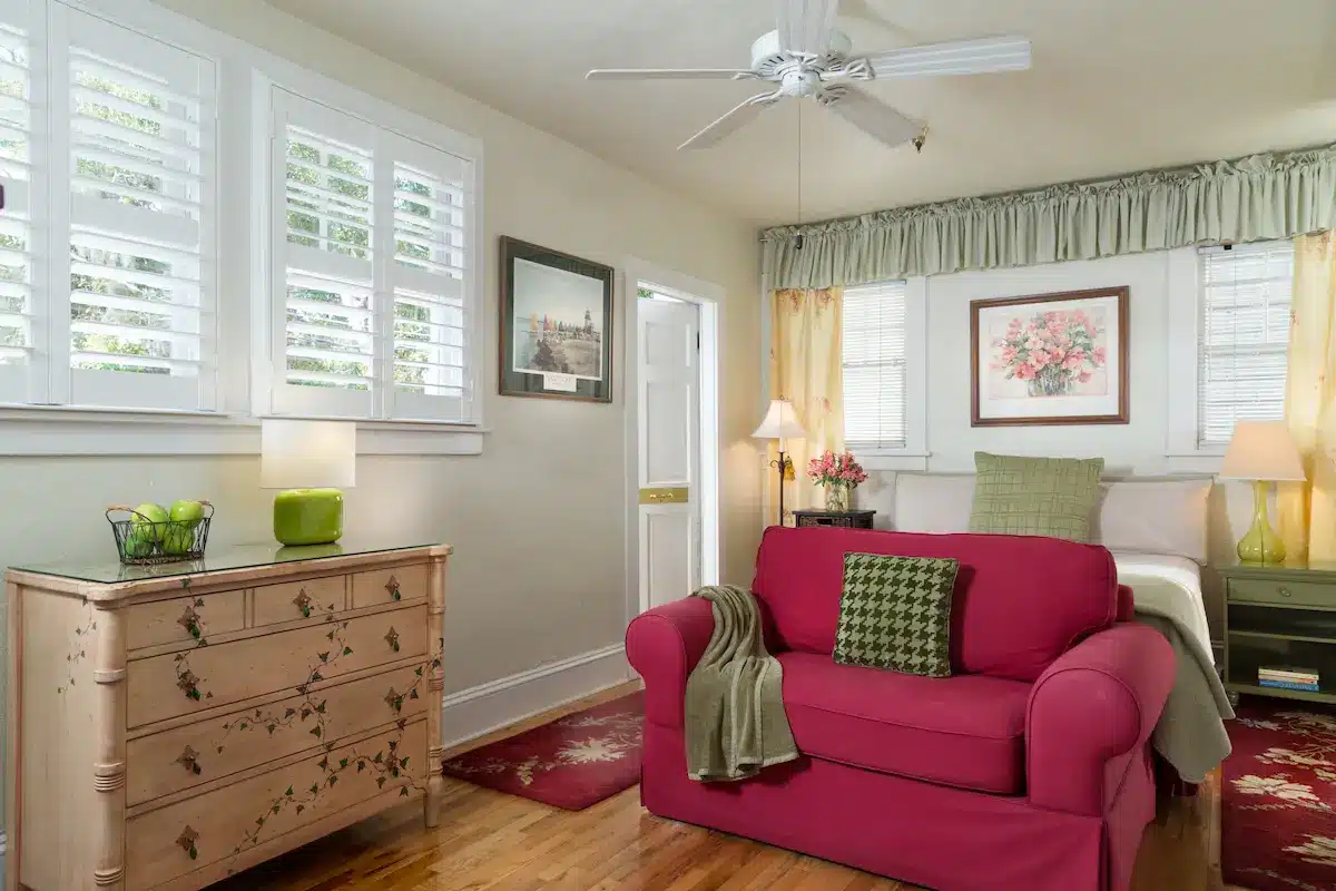 Nieves is a first floor ADA compliant room, with a private entrance via a ramp from outside in addition to its entry from the main hall of the Inn. This is a secluded and private room, decorated in comforting hues. This bed and breakfast room features a queen bed plus a love seat which converts into a twin sized sleeper; a third person can stay in Nieves at an additional fee. Enjoy the bright lighting and wood floors. The bathroom has a triple wide shower which is wheelchair accessible, and there are grab bars throughout the bathroom.