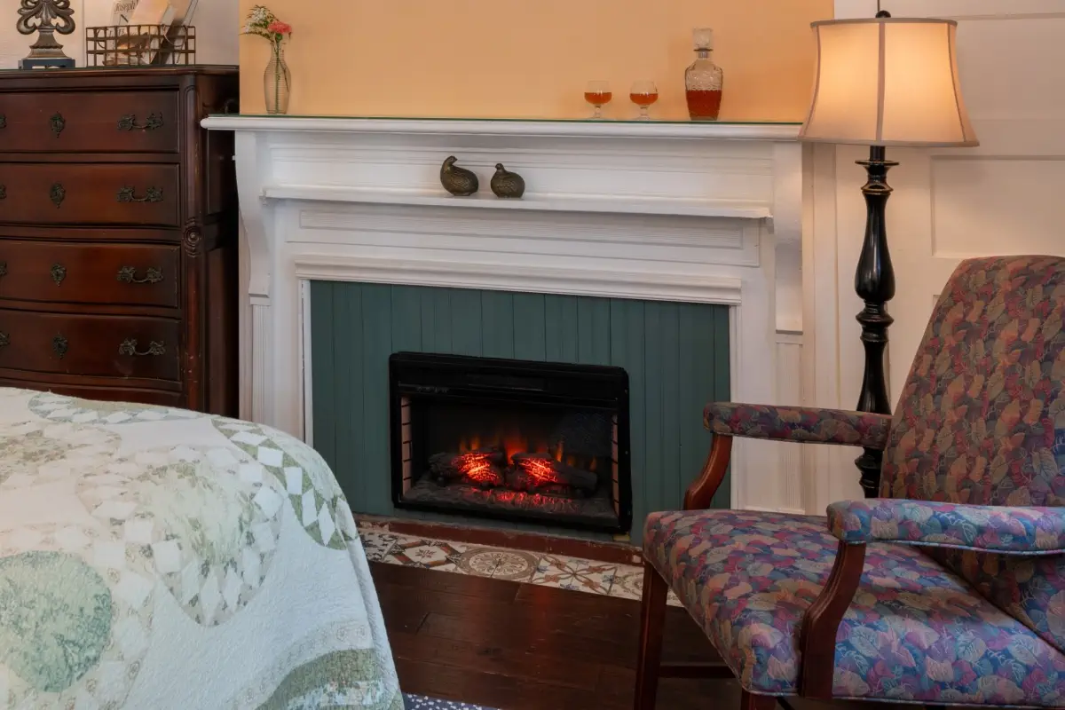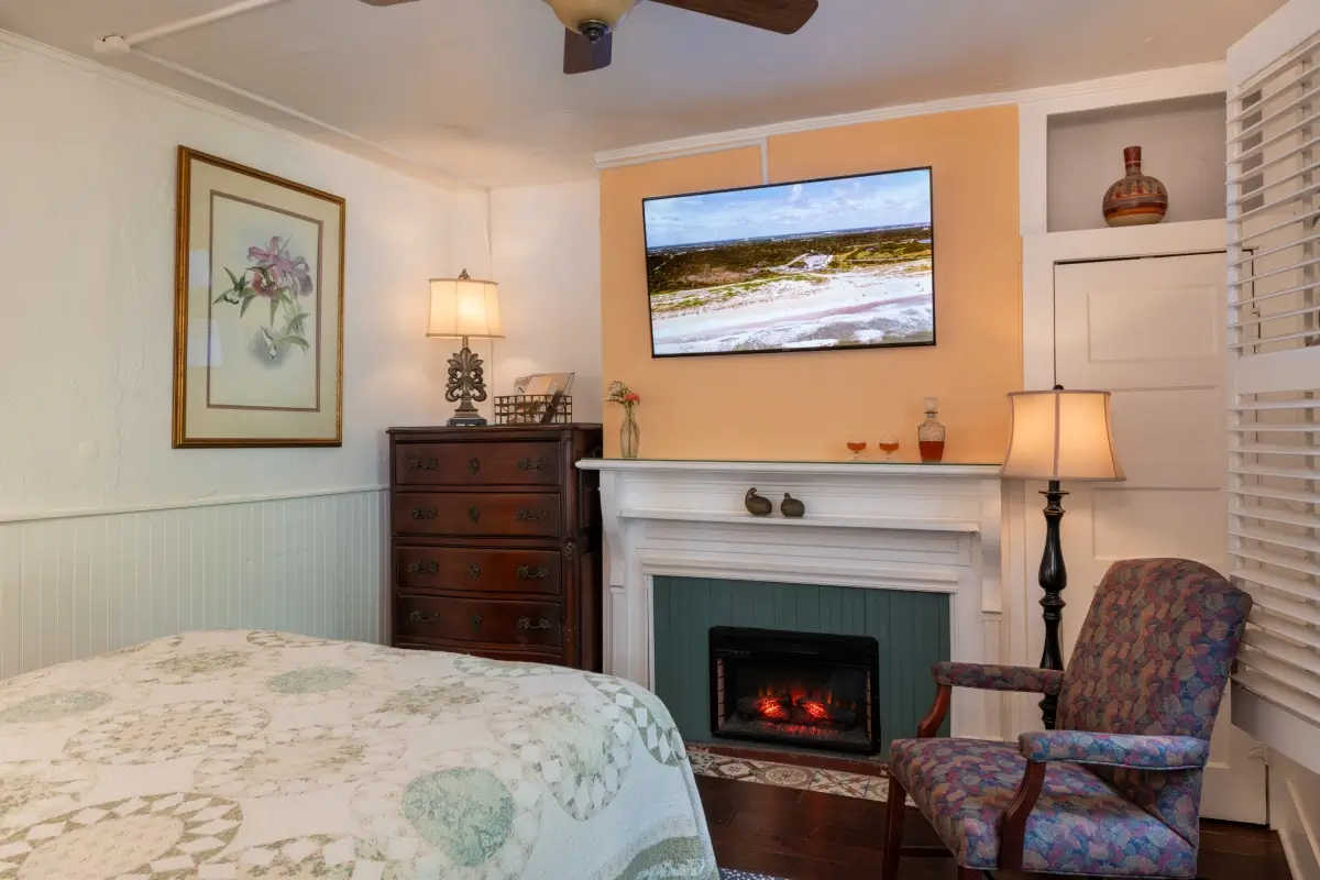 Choose Marie’s Room for a cozy and affordable getaway on the first floor in the heart of the Main Inn at our St. Augustine Bed and Breakfast. Perfect for couples or solo travelers, this pet-friendly retreat near the pool offers a comfortable queen bed, a sparkling modern bathroom with a walk-in shower, and a glowing electric fireplace to set the mood year-round.